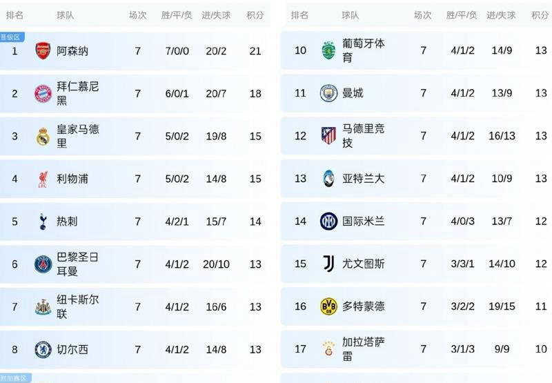 从当前积分榜来看,阿森纳豪取七连胜锁定前两名,紧随其后的是拜仁慕尼黑18分,皇家马德里和利物浦均得15分,热刺积14分排紧随其后。同时有7支球队以13分并列,这13支队伍无疑将是晋级16强的最强竞争者。