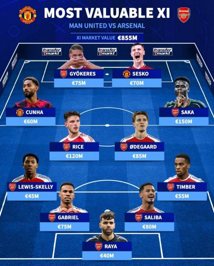 直播吧8月17日讯 英超首轮焦点战阿森纳对阵曼联即将打响,德转盘点了两队球员身价最高阵容,具体如下: