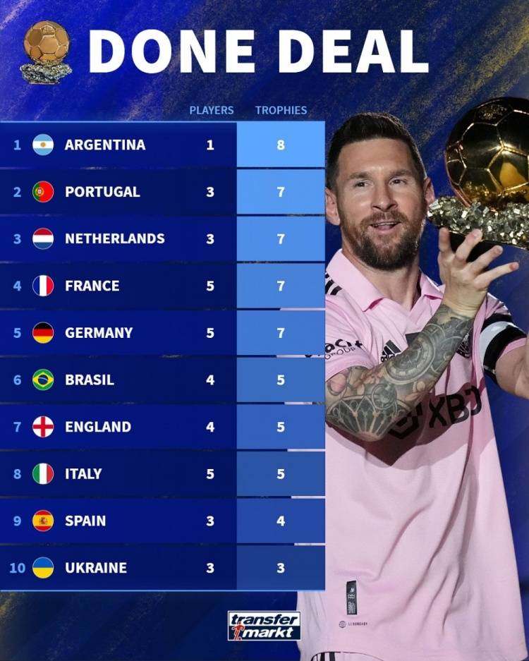 阿根廷排名第一,8个,都是梅西。其他国家,都是好几个球员组队,但还是被梅西压制。第二是葡萄牙,3个球员,7个金球奖(包括2个四大皆空金球奖)。第三是荷兰3个球员,7个金球奖。第四是法国,5个球员,7个金球奖。登贝莱如果获奖,那么法国就能在数量上追平阿根廷,但有6个球员,而阿根廷只有梅西,所以阿根廷还是排名第一。第五是德国,也是5个球员、7个金球奖。然后是4个球员、5个金球奖的巴西和英格兰。意大利,5个球员、5个金球奖。西班牙,3个球员、4个金球奖。乌克兰,3个球员、3个金球奖。乌克兰属于是吃时代福利,现在他们的足球跟不上世界顶级范围了。